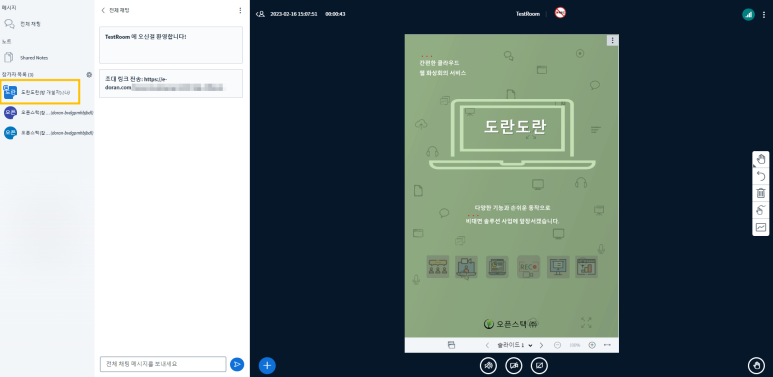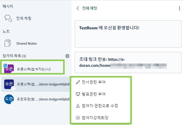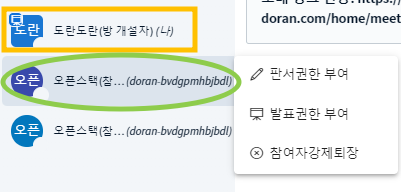 - 다른 참석자를 선택하여, 판서 권한 부여 / 발표 권한 부여 / 참여자 권한으로 수정 / 참여자 강제퇴장 가능