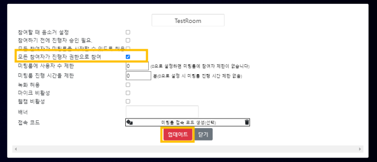 - '모든 참여자가 진행자 권한으로 참여' 설정 클릭 > 업데이트