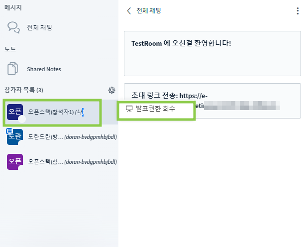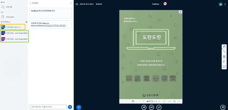 - 방 개설자를 비롯한 모든 참석자들 네모 표시, 권한 동등하게 부여됨