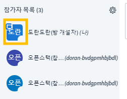 - 방 개설자(진행자)만 네모로 표시(권한 부여받은 자만 네모), 참석자는 동그라미 표시(권한 X, only 참석자)