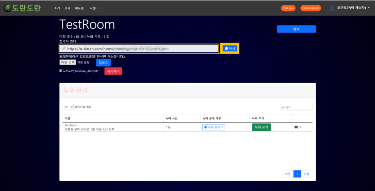 또한, 방 개설 후에 참석자 초대 시에는 참가자 초대 링크를 복사해서,