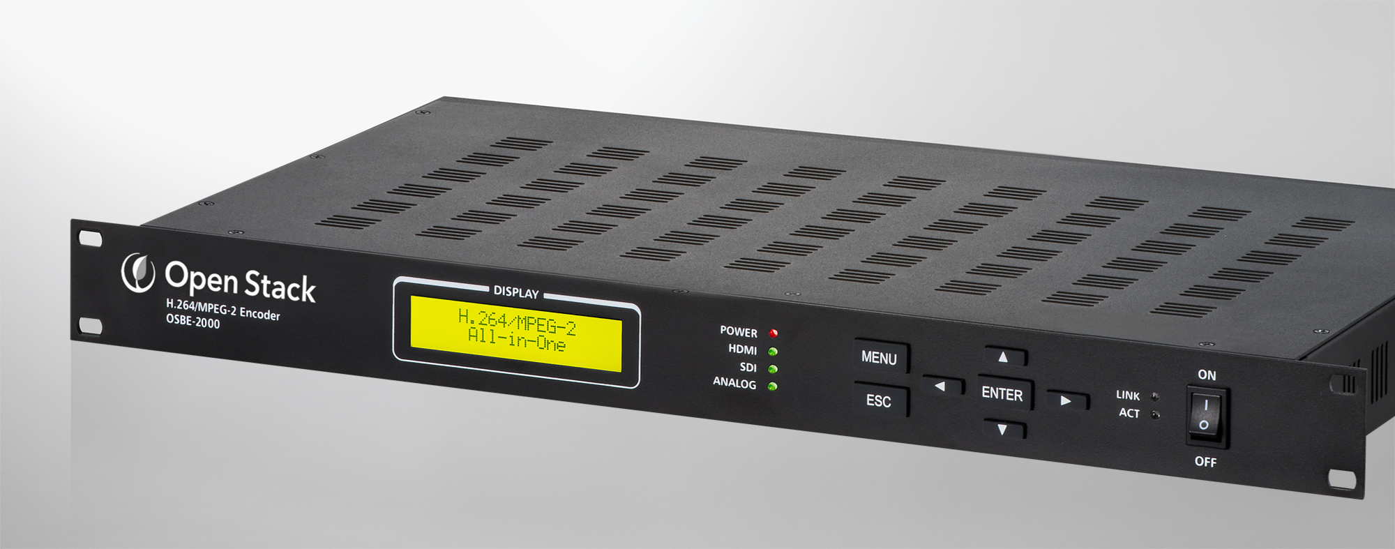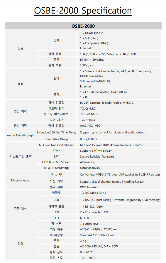 OSBE-2000 은 HDMI, SDI, Component, Stereo Analog Audio 등을 통해서 입력되는 영상과 음성신호를 H.264, MPEG-2 등의 영상 codec 과 MP2, AAC 등의 음성 codec 으로 압축하고 이를 디지털 전송에 적합한 MPEG-2 Transport Stream 로 formatting 한 다음 RF 혹은 IP 로 출력하는 HD 8VSB Modulator 일체형 방송용 Encoder 입니다.
