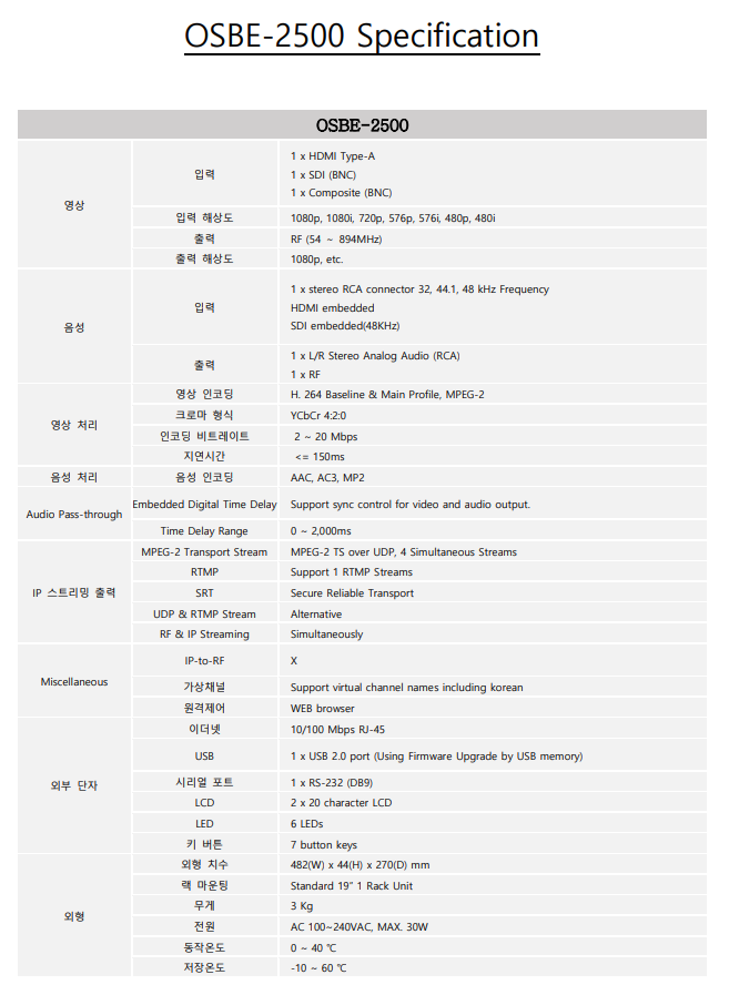 OSBE-2500 은 HDMI, SDI, Composite, Stereo Analog Audio 등을 통해서 입력되는 영상과 음성신호를 H.264, MPEG-2 등의 영상 codec 과 MP2, AAC 등의 음성 codec 으로 압축하고 이를 디지털 전송에 적합한 MPEG-2 Transport Stream 로 formatting 한 다음 RF로 출력하는 HD 8VSB Modulator 입니다.