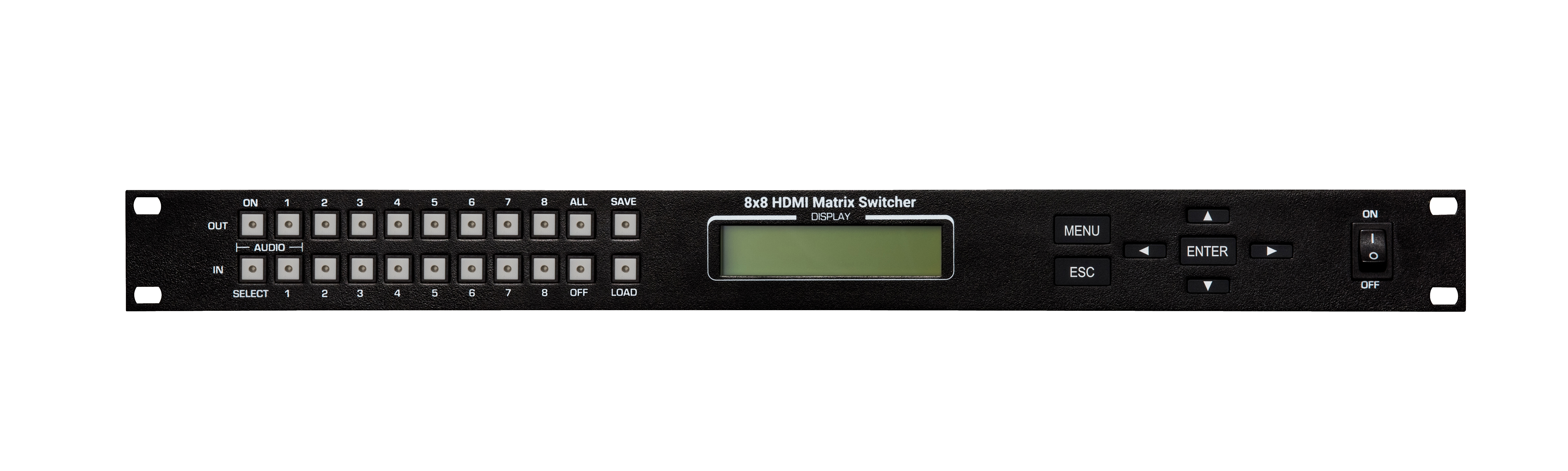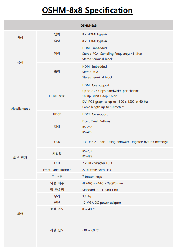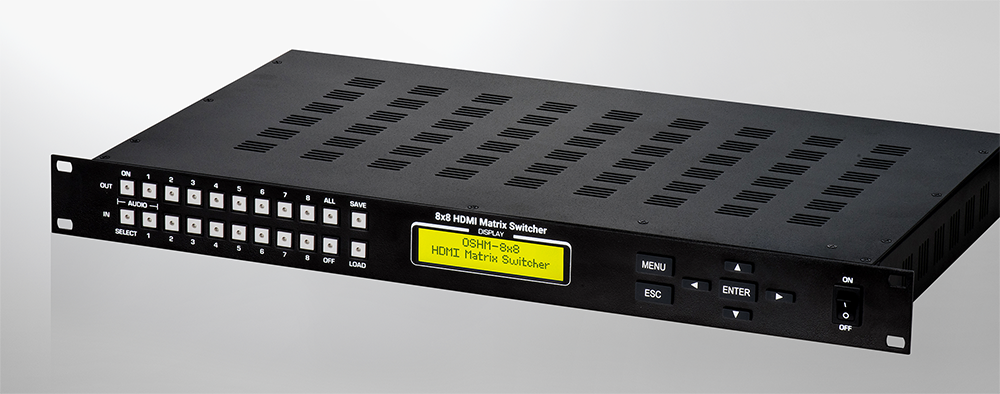 OSHM-8x8 HDMI Matrix Switcher 는 8 개의 HDMI 1.4a 입력을 8 개의 HDMI 1.4a 출력으로 사용자가 원하는 대로 연결할 수 있는 방송용 HDMI router 로서 기존의 HDMI matrix switcher 에서는 찾아볼 수 없는 S/PDIF Digital Audio 와 Stereo Analog Audio 입력 지원 등을 합니다.