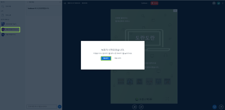 - 호스트 권한을 가진 개설자가 녹화 시작 버튼을 누르면, 참석자는 녹화가 시작됨을 알리는 팝업창이 뜹니다.