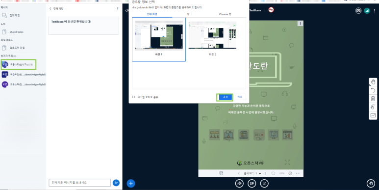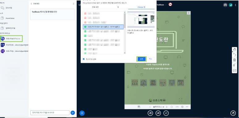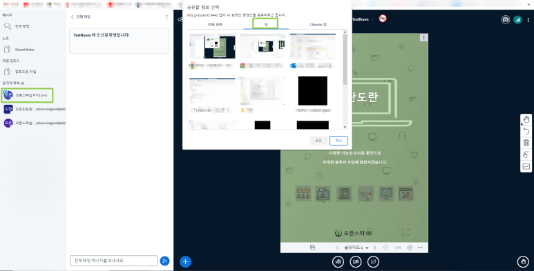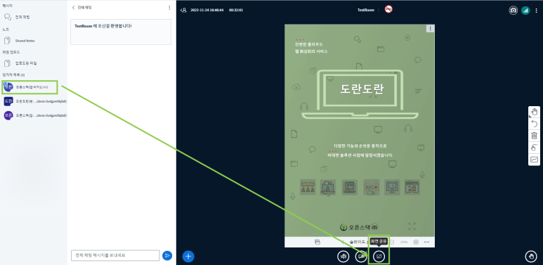 그래서 해당 기능은 방 개설자(진행자)가 발표자 권한을 부여한 참석자에 한하여 사용이 가능합니다.