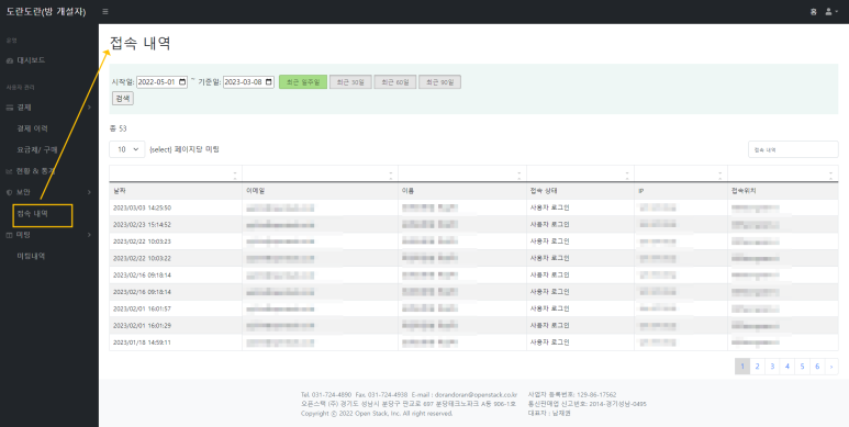 5. 오늘은 관리자 페이지 탭에서 접속 내역을 소개 드리고 자 합니다.