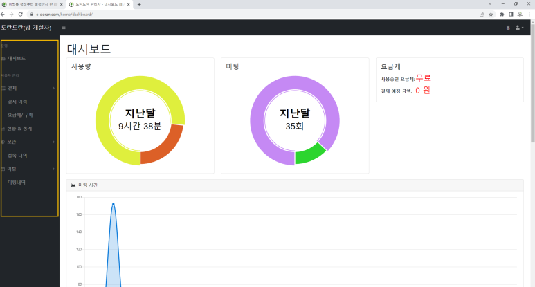 4. 관리자 페이지 탭에 가시면, 크게 대시보드, 결제 사항(결제 이력, 요금제) , 현황 및 통계, 접속 내역, 미팅 내역을 확인할 수 있습니다.