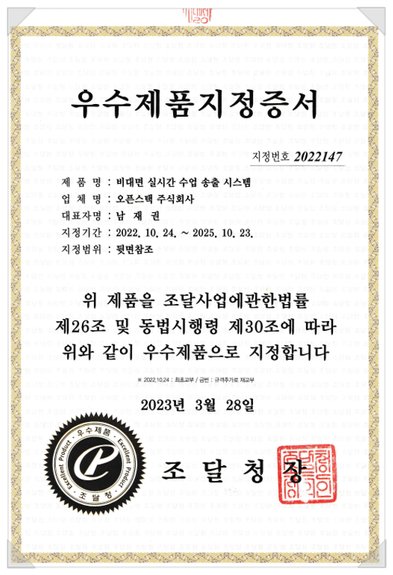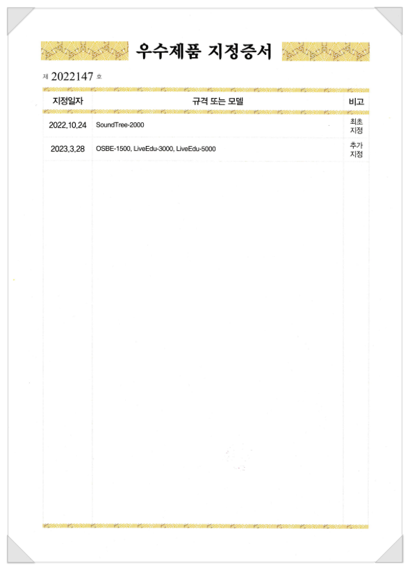 2022년 10월 우수제품 지정을 받았고, OSBE-1500, LiveEdu-3000, LiveEdu-5000도 규격추가 승인을 받았습니다.