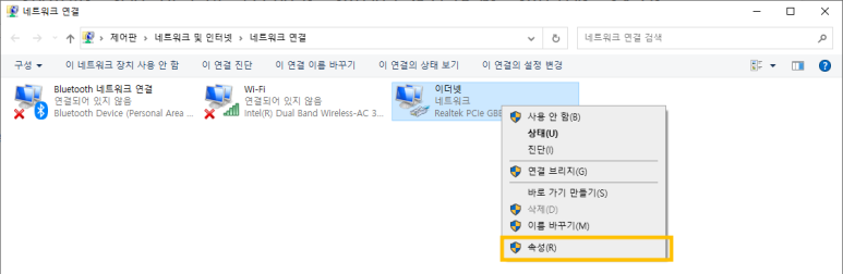 6) 이더넷 마우스 오른쪽 클릭 > 속성 선택 클릭
