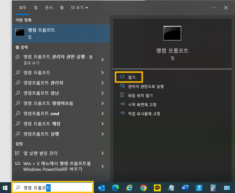 1) 시작 > 명령 프롬프트(혹은 cmd) 검색 > 열기