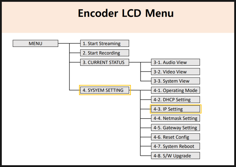 3) 방향키 조작하여, 4번 SYSTEM SETTING > 4-3. IP SETTING 선택