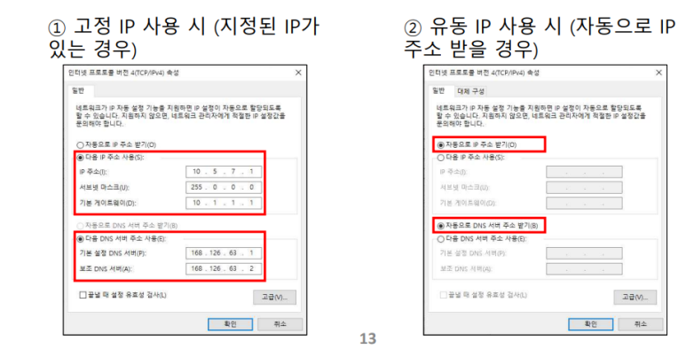 * 학교, 관공서 등 폐쇄망을 사용하는 경우(장비마다 IP 지정 값이 있는 경우)