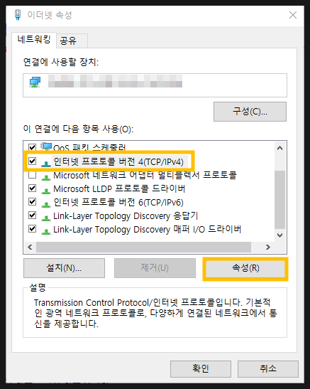 - 인터넷 프로토콜 버전 4(TCP/IPv4) 선택 후 속성 클릭