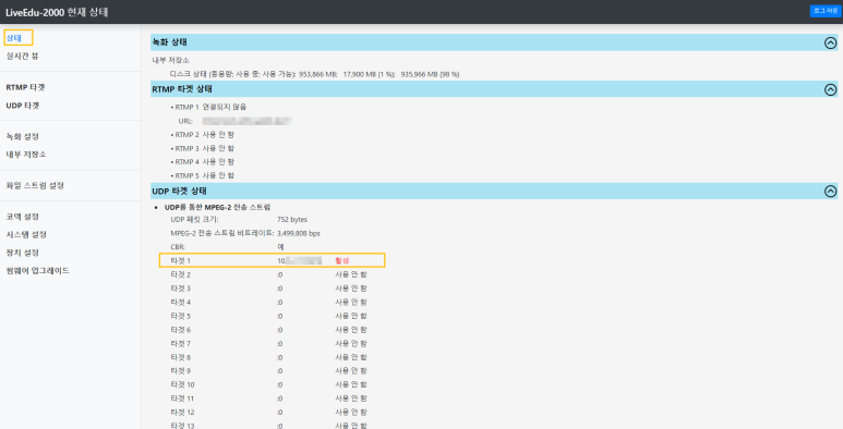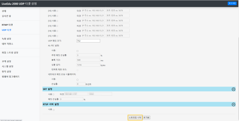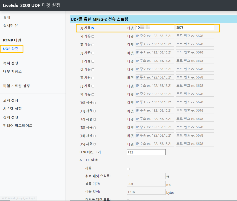 - 타겟 IP는 장비에서, 스트리밍 출력을 받을 IP 주소입니다.