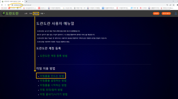 - 도란도란 홈페이지(e-doran.com)에 '미팅룸 만드는 방법'의 이름으로 매뉴얼이 등록되어 있습니다.