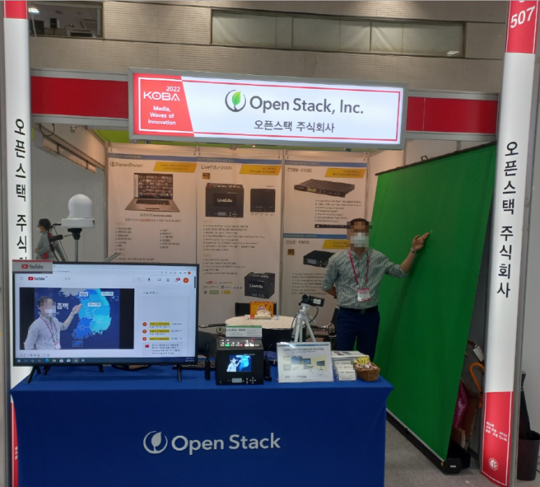 - 활용 예로는, 아래 이미지와 같이 배경 소스만 다른 것으로 바꾸어 수업 혹은 행사 내용을 반영하여 활용이 가능합니다. (왼쪽 큰 TV는 유튜브 실시간 송출 중인 화면, 중간의 LiveEdu-5000 제품으로 실시간 모니터링 가능)