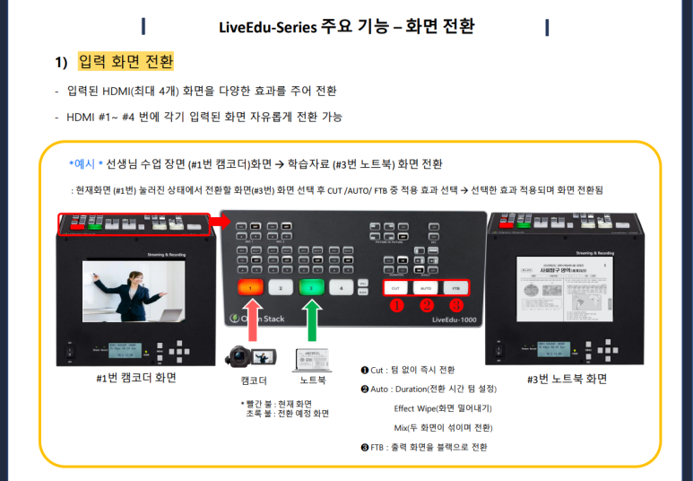 Cut, Black 화면 송출 등의 기능을 사용하여 필요시 자유롭게 화면 전환이 가능합니다.